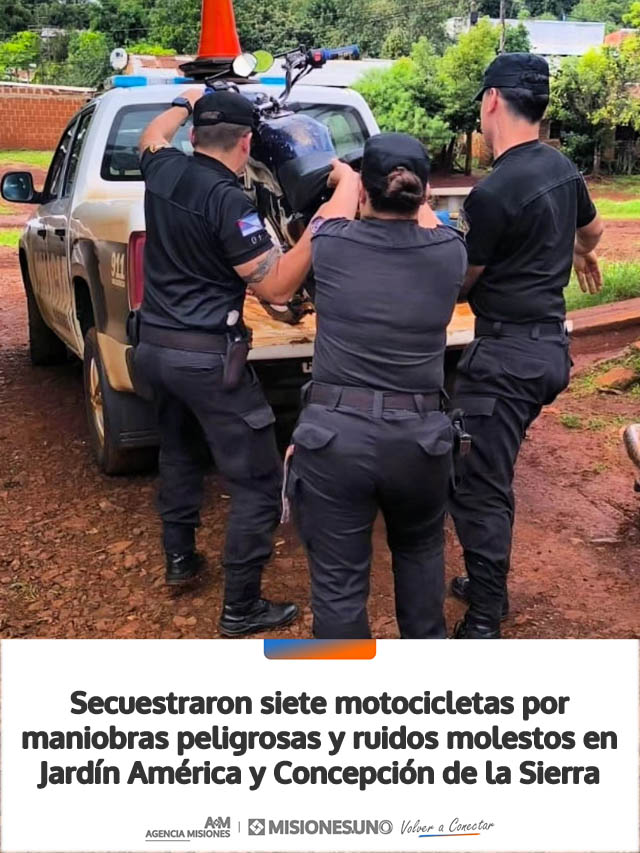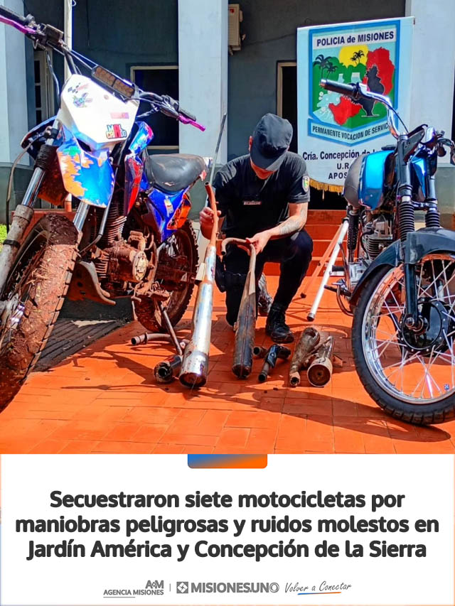 Siete motocicletas fueron secuestradas en distintos procedimientos policiales realizados en Jardín América y Concepción de la Sierra, en el marco de operativos vinculados a conducción temeraria, contraexplosiones, picadas ilegales e infracciones a la Ley Nacional de Tránsito.